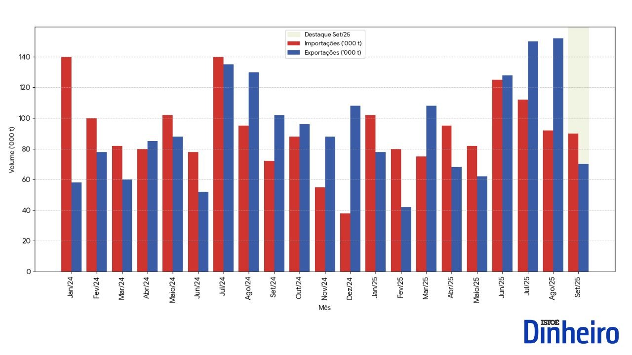 Segundo a consultoria, a retração pode contribuir para um maior equilíbrio entre oferta e demanda, considerando que o consumo interno segue estável. O relatório alerta não haver riscos para uma possível escassez de arroz, já que os estoques finais da safra atual indicam um certo “conforto”. A solução para esvaziar os estoques? Aumentar as vendas externas. O que vem sendo difícil em um cenário atual em que a balança brasileira foi negativa em setembro. Veja: