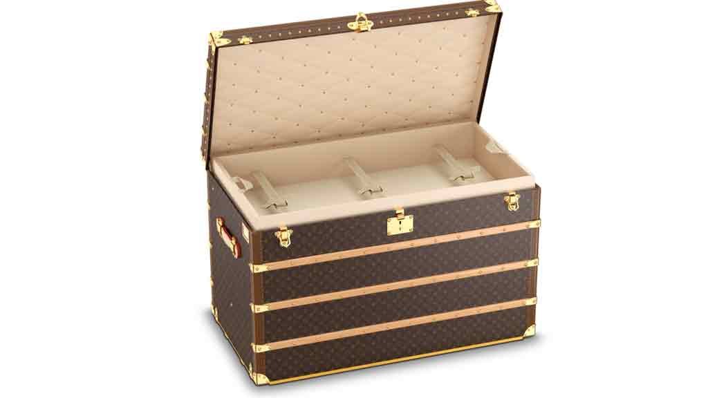Produzido pela Louis Vuitton, o Malle Haute 110 é coberto com o canvas monograma da marca – uma lona impermeável de altíssima qualidade com as iniciais LV impressas -, alça em couro VVN, estrutura feita em madeira Okoume, Álamo e Faia, além de acabamentos e cadeados em metal dourado. Perfeito para guardar roupas de cama, banho ou vestuário. A peça tem 1,10 mt de comprimento, 69 cm de altura e 61 cm de profundidade. À venda no site e em algumas lojas físicas.